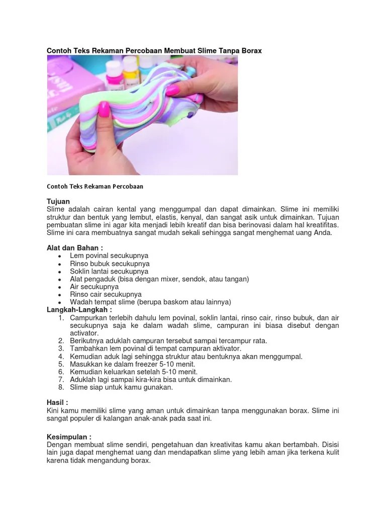 Cara membuat slime tanpa borax. Berikut ini merupakan sebuah contoh tentang percobaan uji coba membuat slime aman . Contoh teks laporan percobaan membuat slime. Tujuan pembuatan slime bebas boraks adalah untuk lebih berkreasi dan berkreasi dalam berkreasi. Contoh teks laporan percobaan membuat slime tanpa boraks tujuan agar kita menjadi lebih kreatif dan bisa berinovasi dalam hal kreativitas.