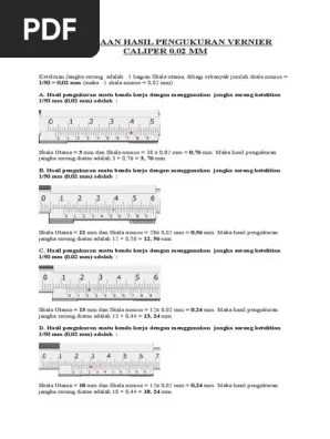 Pembacaan ukuran ketelitian 0,02 mm. Berikan contoh lagi penghitungan jangka sorong dengan nilai 0,02 mm. Jumlah strip dari 0 ~ 1 5 2 ketelitian 0,02 mm 0,05 mm artinya tiap 1 strip pada skala. Skala utama = 10 cm. Tambahkan nilai pembacaan pada skala utama dengan nilai pembacaan pada skala vernier tersebut. Contoh soal jangka sorong 0,02. Modul fisika kelas x besaran dan. Jangka sorong mempunyai nilai 0,02 mm setiap ruas pada skala vernier. Contoh hasil pengukuran jangka sorong dengan ketelitian 0,02 mm. Jangka sorong biasanya digunakan oleh para engineer untuk mengukur diameter benda atau lubang pipa. Skala utamanya adalah 2,3 mm dan skala nonius = (2 x 0,01 cm) = 0,02 cm. Kemudia membaca vernier atau skala nonius= 0,02 cm (setelah nol dari . Itulah yang dapat kami bagikan terkait contoh soal jangka sorong 0 02.
